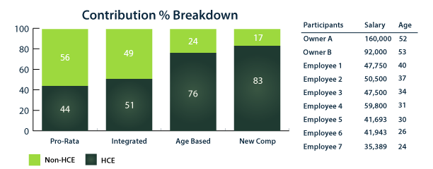 Essentially, this design is attractive to small business owners where they are—as a class or group—typically older than the rank and file employees. The graph below provides a comparison of the percent of the total contribution given to the owners for 4 different plan designs. In this scenario, Owner A and Owner B are considered Highly Compensated Employees (HCE), the remainder of the employees are considered to be non-highly compensated employees (NHCE). Note the larger percentage given to the HCEs in the New Comparability Plan.